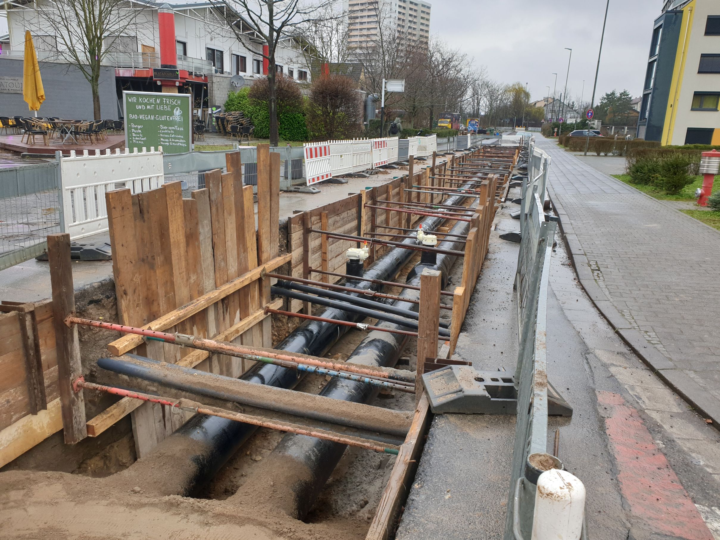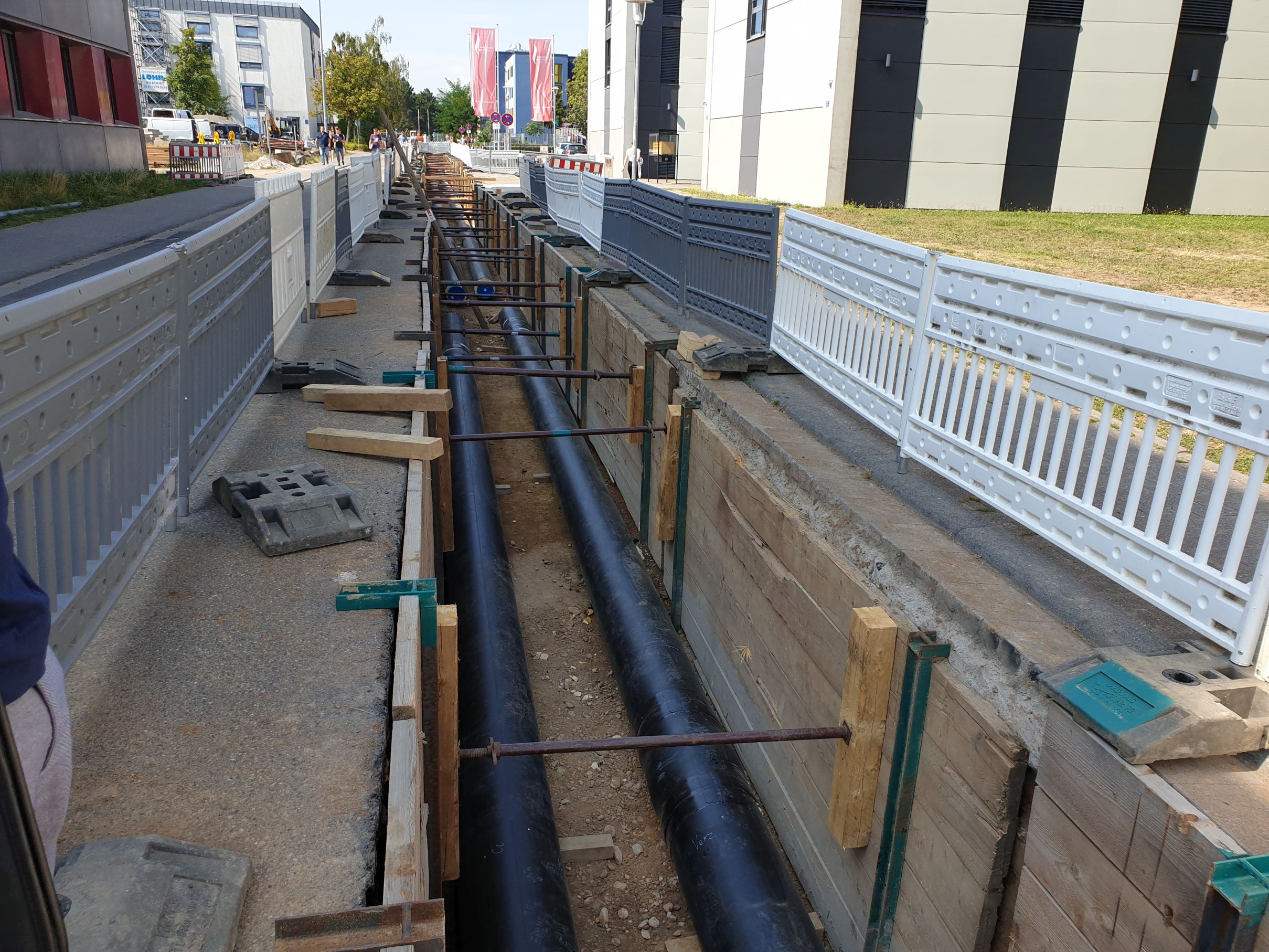 Die neue Fernkältezentrale wird mit zwei Stichleitungen an das alte vorhandene Kältenetz angeschlossen. Die Fernkältetrasse erstreckt sich über insgesamt 1,04 km in verschiedenen Straßen des Campus der Johannes-Gutenberg-Universität Mainz. Die Trasse besteht aus 2 Fernkälterohrleitungen (Vor- und Rücklauf) und einem Leerrohrsystem bestehend aus 2 Lagen mit jeweils 2 Rohren. Die Höhenlage der Trasse ist einerseits durch die Mindestüberdeckung vom Rohrhersteller vorgeben, andererseits sorgen Bestandsleitungen im Trassenverlauf dafür, dass teilweise erheblich von der Mindestüberdeckung abgewichen werden muss.
